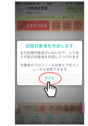 - 「記録対象者を作成します」のメッセージを読み、「すすむ」をタップします。