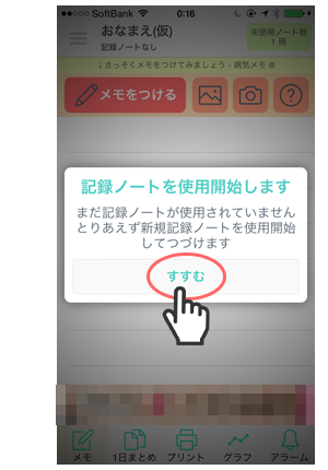 - 「記録ノートを使用開始します」のメッセージを読み、「すすむ」をタップします。