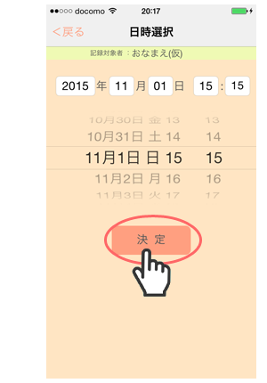日時は、画面中央の、日/時/分 をスクロールして設定します。画面上部の、年/月/日/時/分 に入力することもできます。