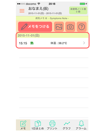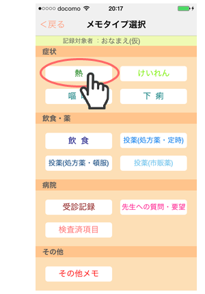 発熱に関するメモをつけたいので、メモタイプ「熱」を選択します。