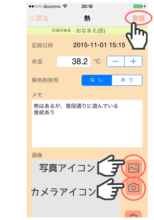 - 「熱」画面で、各項目の選択・記載をし、画面右上の「登録」をタップします。