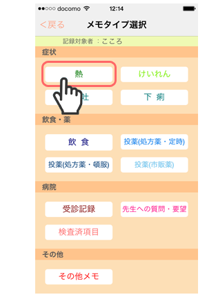 1. 「メモタイプ選択」画面で「熱」をタップします。