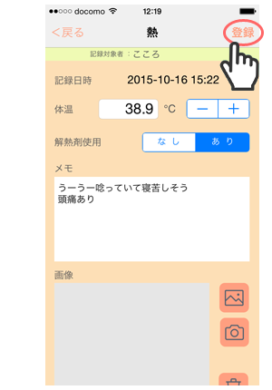 2. 「熱」画面で、「体温」「解熱剤使用」の有無、「メモ」「画像」を設定できます。