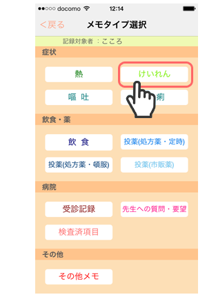 1. 「メモタイプ選択」画面で「けいれん」をタップします。