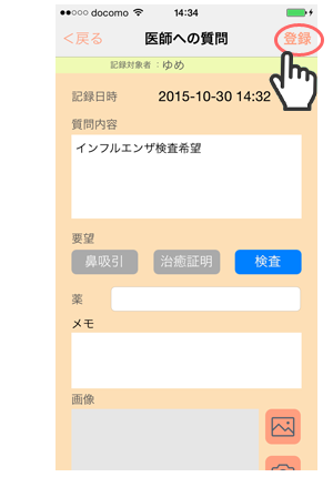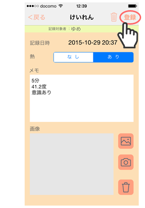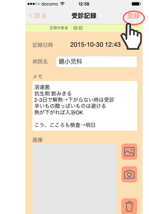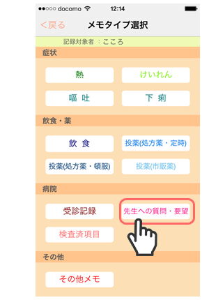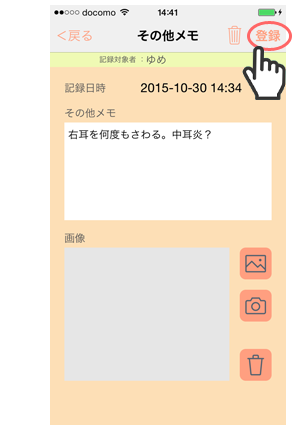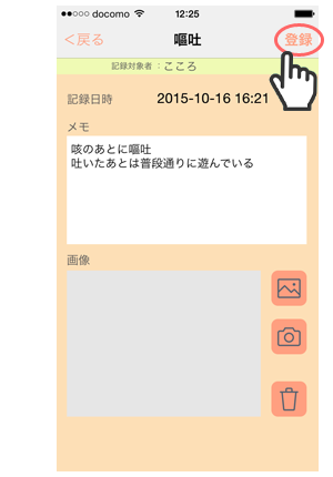選んだメモタイプの画面で、こどもの症状に合うボタンを選択・記載、写真撮影をし、メモを登録します。