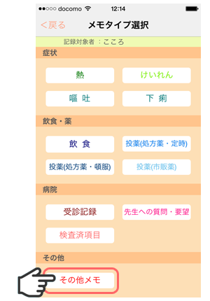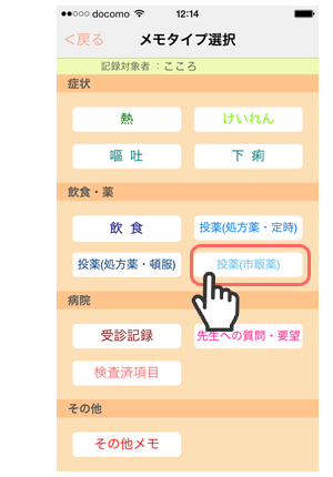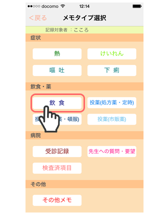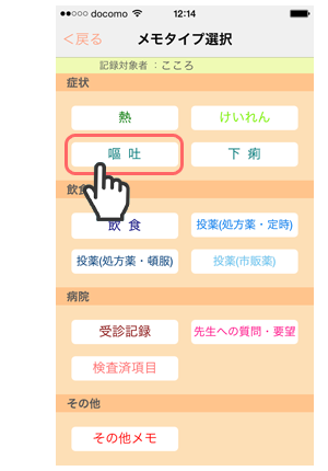 1. 「メモタイプ選択」画面で「嘔吐」をタップします。