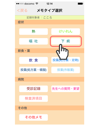 1. 「メモタイプ選択」画面で「下痢」をタップします。