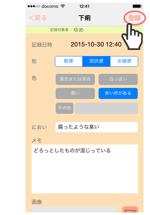 2. 「下痢」画面で、「形(軟便/泥状態/水様便)」「色(黄色または茶色/白っぽい/黒い/赤い所がある/その他)」「におい」「メモ」「画像」を設定できます。