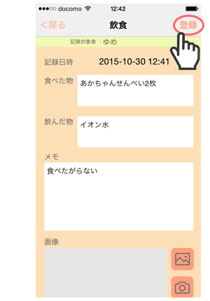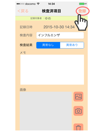 2. 「嘔吐」画面で、「メモ」「画像」を設定できます。