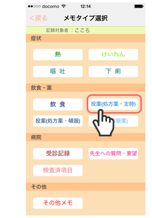 1. 「メモタイプ選択」画面で「投薬(処方薬・定時)」をタップします。