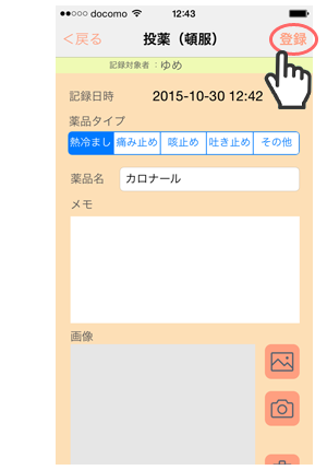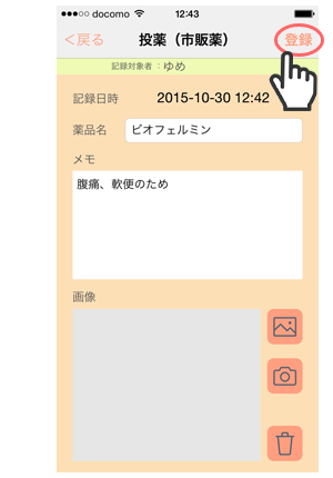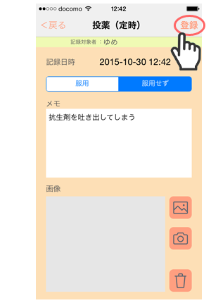 「服用」の有無、「メモ」「画像」を設定できます。こどもが嫌がって処方薬を飲めない場合などにも記録しておくとよいでしょう。