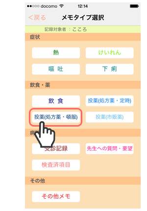 1. 「メモタイプ選択」画面で「投薬(処方薬・頓服)」をタップします。