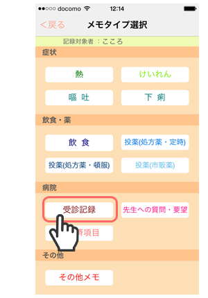 1. 「メモタイプ選択」画面で「受診記録」をタップします。