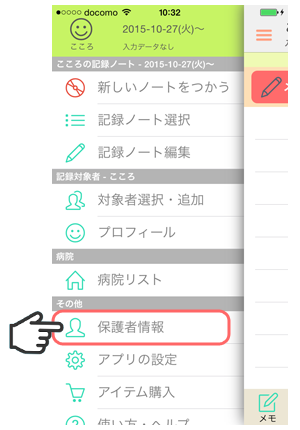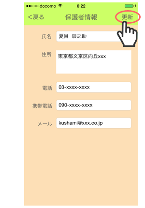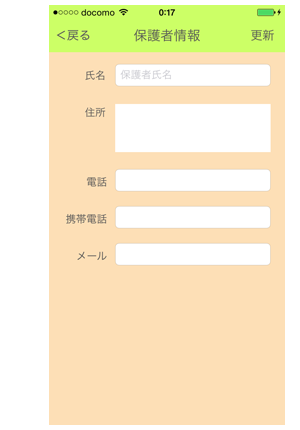 保護者情報を登録する左メニューの「保護者情報」をタップします。保護者情報画面で、保護者情報を設定します。 次の項目を設定できます。 氏名住所電話携帯電話メール保護者情報画面右上の「更新」をタップし登録します。