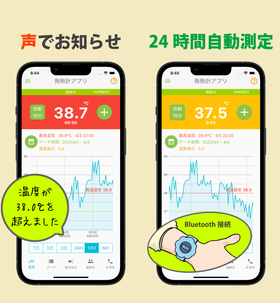 『発熱計』はウェアラブル温度計デバイスと専用スマホアプリの組み合わせで動作し、24 時間発熱状態を見守り、グラフに表示、高温時には声と通知で異変を知らせます。